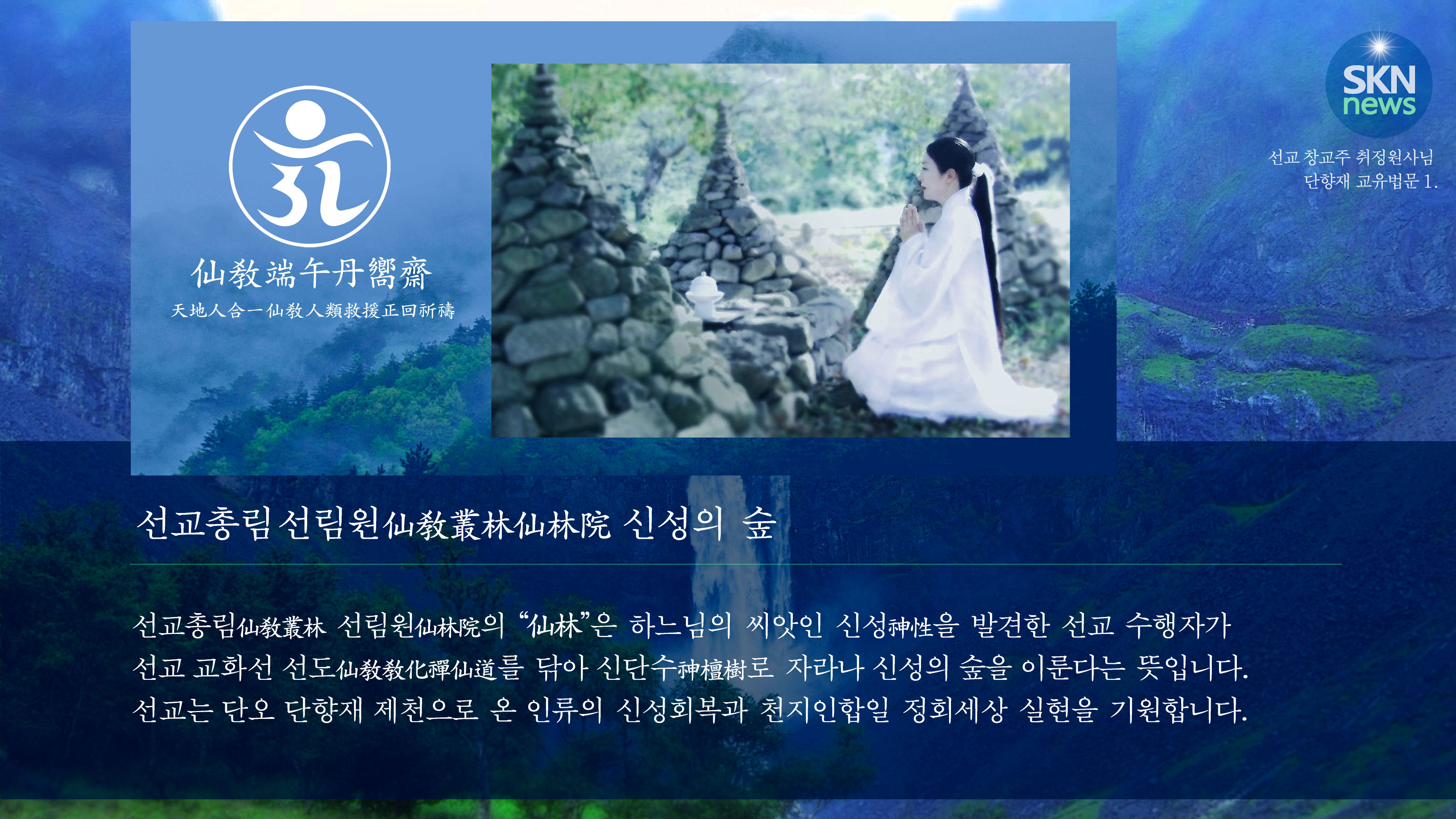 선교총림(仙敎叢林) 선림원(仙林院)의 ‘仙林’은 하느님 환인(桓因)께서 생무생일체에 부여하신 빛의 씨앗인 ‘신성(神性)’을 발견한 선교수행자가 선교 교화선 선도(仙敎敎化禪仙道)를 닦아 신단수(神檀樹)로 자라나 ‘신성의 숲’을 이룬다는 뜻이다. 선교(仙敎)는 단향재 단오제천(端午祭天)으로, 온 인류의 신성회복과 천지인합일 정회세상을 실현한다.
