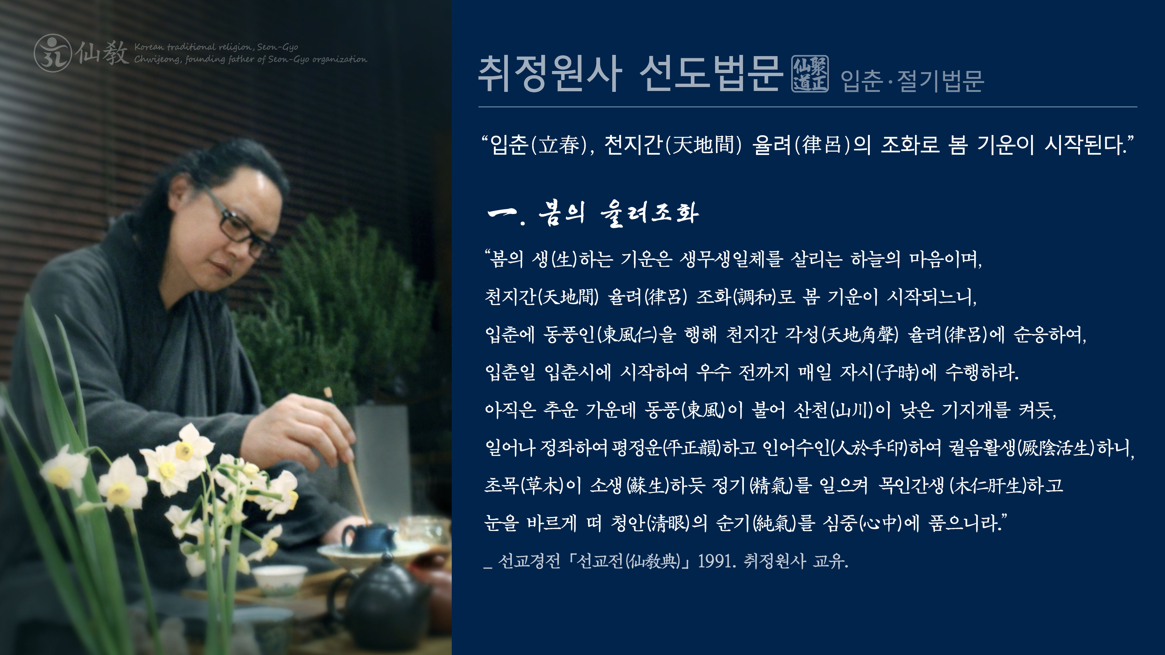 선교 교단의 입춘(立春) 절기법회(節氣法會)는 24절기(二十四節氣)의 향훈(嚮暈)을 베푸시는 하느님 환인상제(桓因上帝)를 경배하는 절기제천(節氣祭天)과 선교 창교주 박광의(朴光義) 취정원사(聚正元師)님의 입춘절기법문(立春節氣法文)에 이어 선교총림(仙敎叢林) 시정원주(時正原主)님의 입춘절기 선도선법(仙道禪法) 동풍인(東風仁) 시연으로 이어졌습니다.